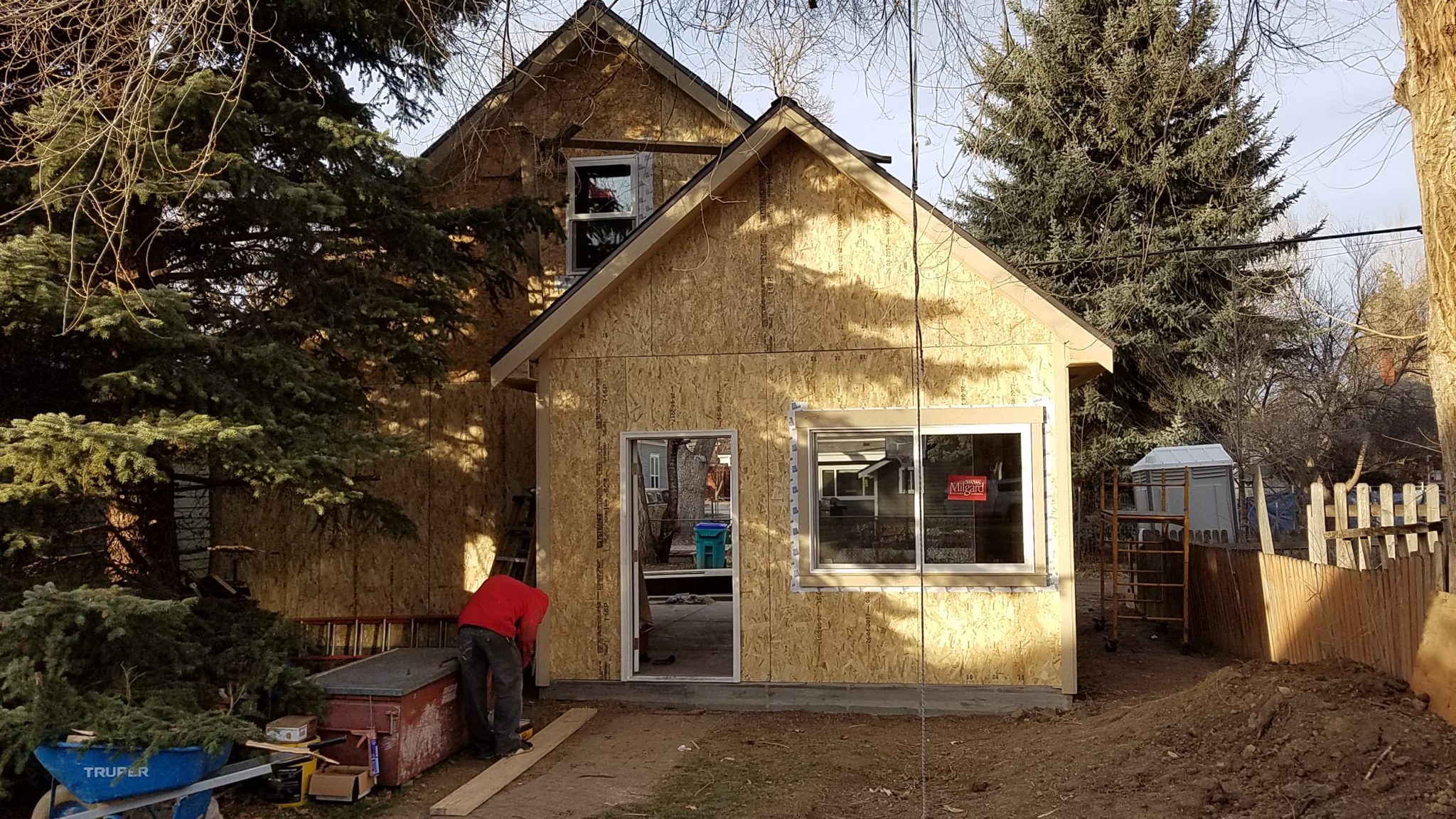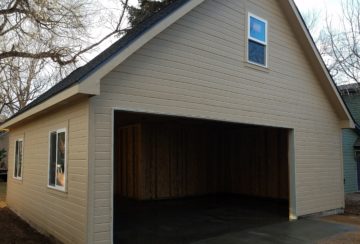 After demolishing the existing single story shed, we poured a new foundation and started building up! This Old Town Fort Collins alley-facing two story garage features a steeply pitched roof, creating extra ‘attic’ space with a staircase for easy storage access. With an extended bay, the homeowner can park a 20′-long vehicle with room to spare!