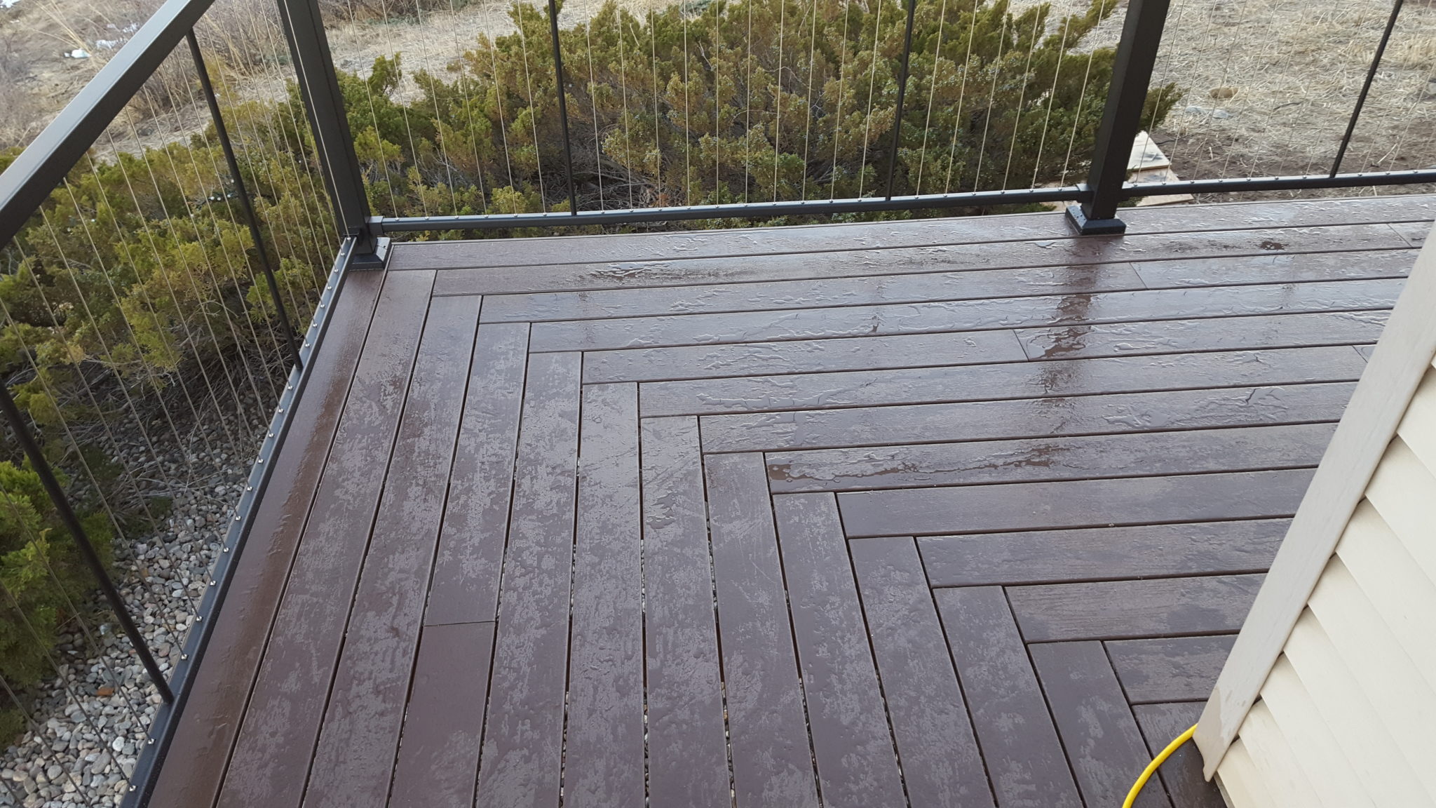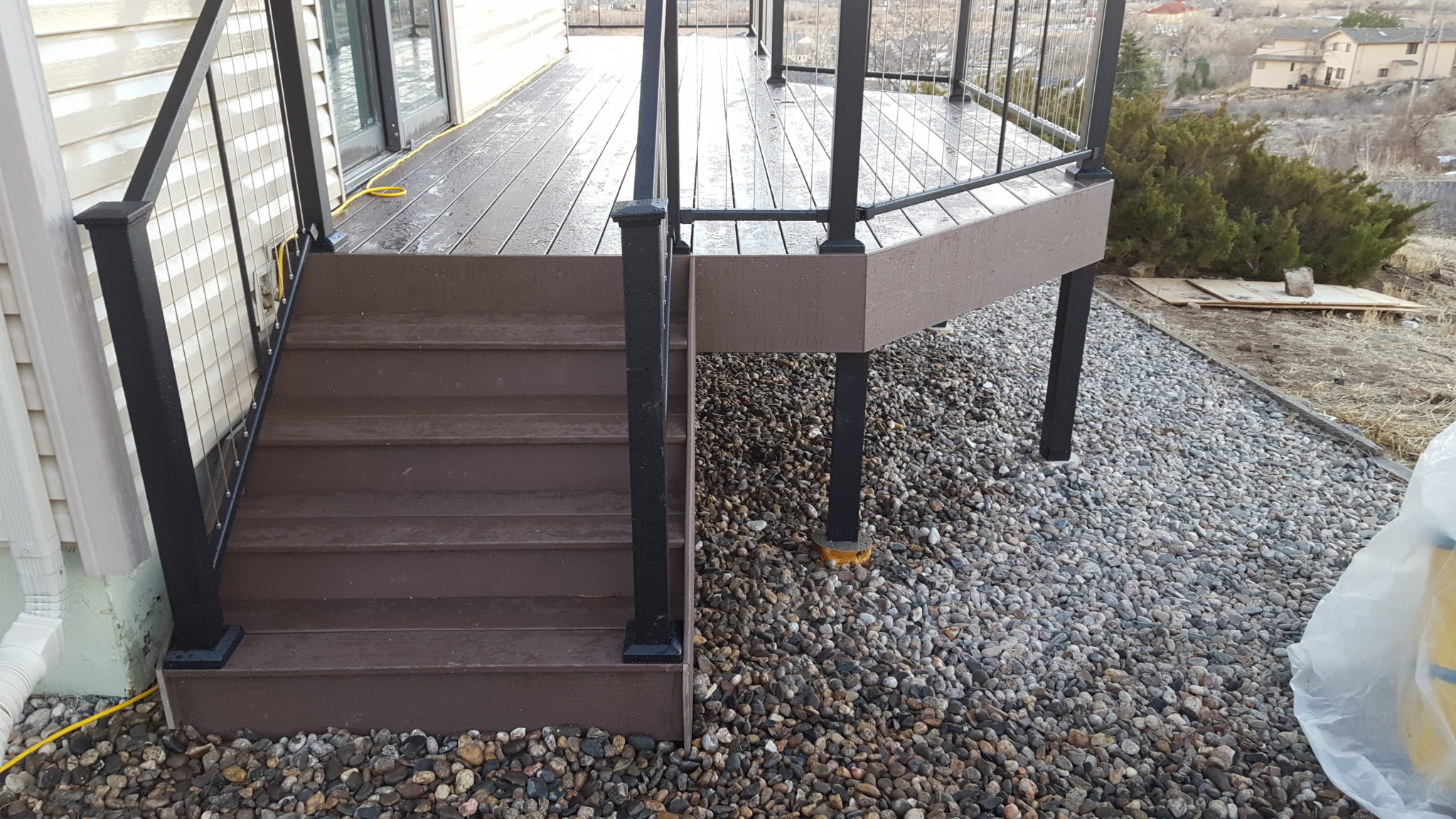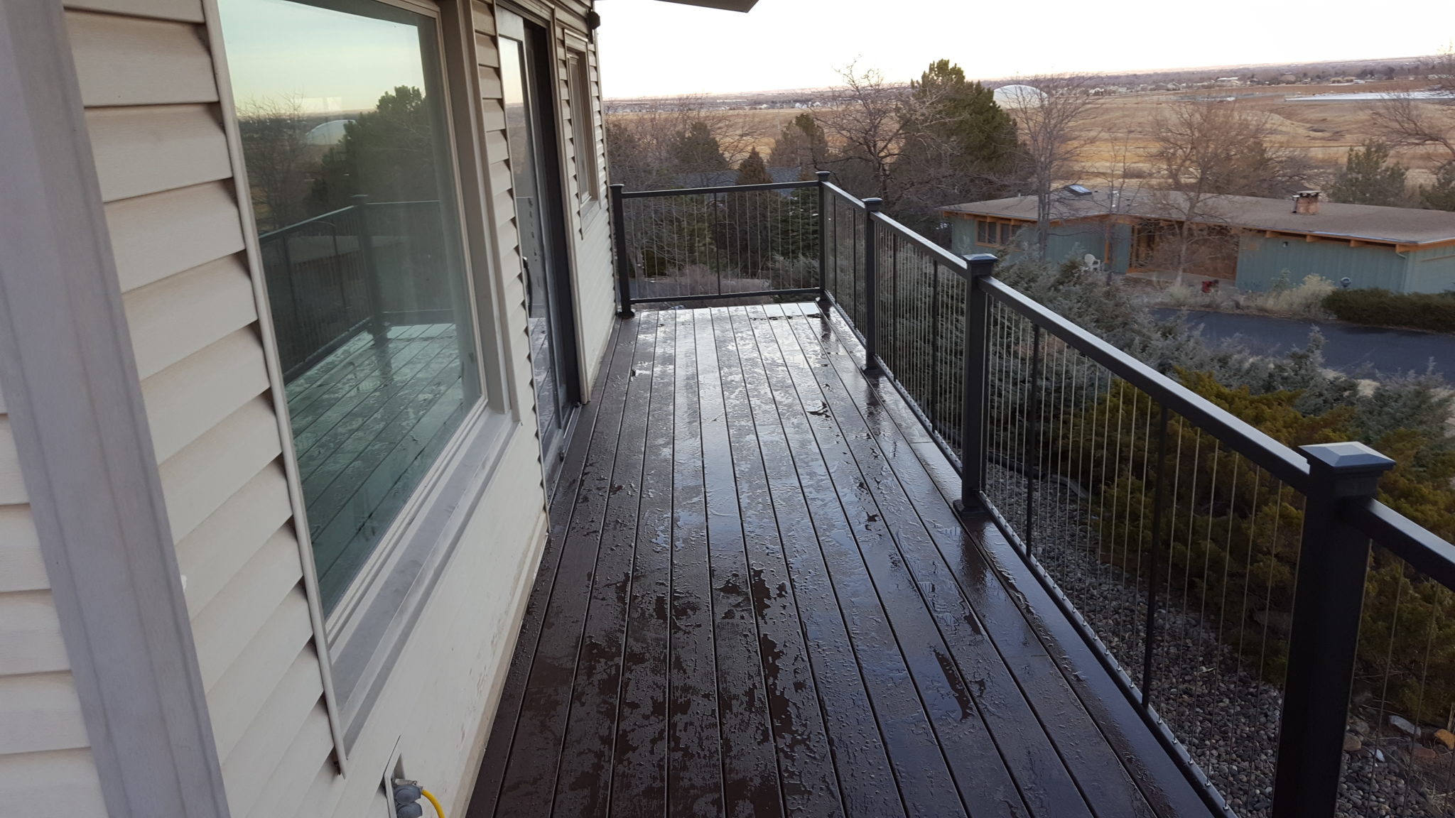 Installed a new composite decking system with decorative wire railing around this foothills residence, in Loveland, CO, to allow for exterior second story access between rooms and create an outdoor living space with a fantastic view.