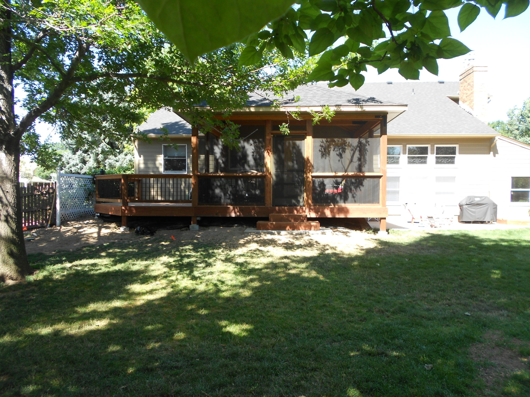 We constructed this sunroom and deck to replace an existing deck. By attaching to the existing framing of the house, we were able to create a seamless transition from indoors to the sunroom, then outdoors on the uncovered deck with decorative hand rail.